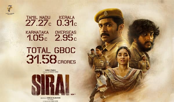 அறிமுக இயக்குனர் சுரேஷ் ராஜகுமாரி இயக்கத்தில் விக்ரம் பிரபு, தயாரிப்பாளர் லலித் மகன் எல்.கே.அக் ஷய் குமார் இணைந்து நடித்து கடந்தாண்டு இறுதியில் வெளியான படம் 'சிறை'. உண்மை சம்பவத்தை பின்னணியாக வைத்து சிறை கைதி பின்னணியில் உருவான இப்படம் ரசிகர்கள் மத்தியில் வரவேற்பை பெற்றது. தொடர்ந்து இப்படம் 25 நாட்களை கடந்தது. 7 கோடிக்கும் குறைவான பட்ஜெட்டில் எடுக்கப்பட்ட இப்படம் ஏற்கனவே 25 கோடி வசூலை கடந்து லாபத்தை தந்தது. தற்போது இப்படம் உலகளவில் ரூ. 31.58 கோடி வசூலித்துள்ளதாக அதிகாரப்பூர்வமாக அறிவித்துள்ளனர். தமிழகத்தில் மட்டும் இப்படம் ரூ.22.27 கோடியும், கேரளாவில் ரூ.31 லட்சமும், கர்நாடகாவில் ரூ.1.05 கோடியும், வெளிநாடுகளில் ரூ.2.95 கோடியும் வசூலை குவித்துள்ளது.